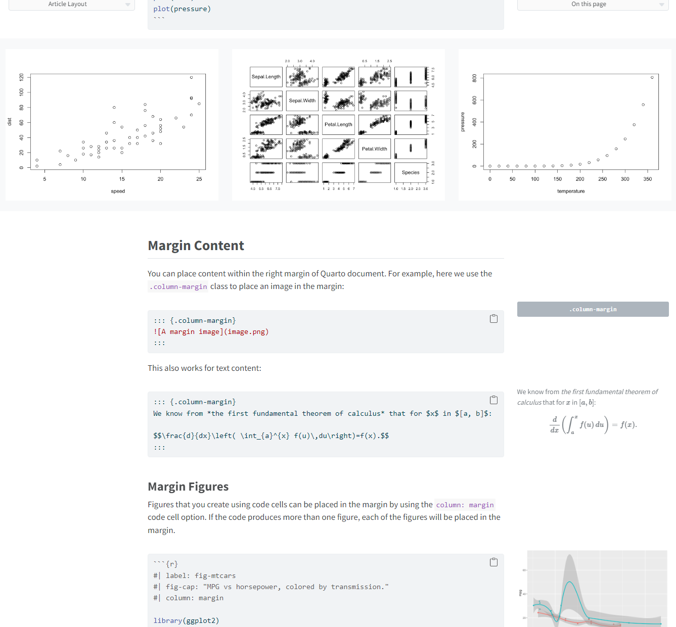 | Available for HTML with distill (Figure layout) ou tufte (Margin content) | Article Layout available for multiple formats and with more flexibility. |